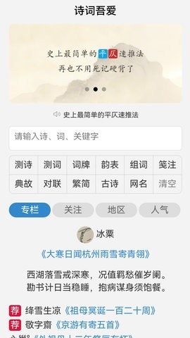 诗词吾爱是超级不错的一款诗词学习软件,软件可以帮助大家进行格律检测,轻松快速的发现哪处不押韵。同时还支持简繁体的转换操作,很人性化,拥有的诗词资源也是比较丰富的,大家可以根据搜索功能找到自己所需的诗词内容,丰富自己的诗词,简洁明了的设计界面更加易于大家使用,有喜欢的朋友快来下载看看吧!