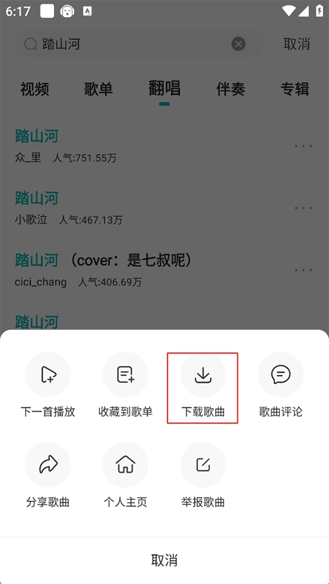 2、点击歌曲右侧的扩展按钮,点击下载歌曲;