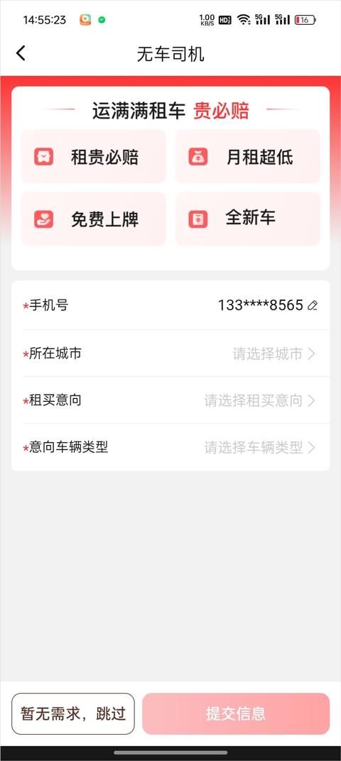 1、进入软件登录好,平台会提供两种注册方式,一是带车加入,二是租车加入,根据实际需求选择,小编以第二种为例子