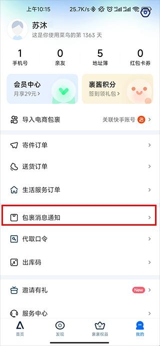 3、打开我的之后,点击包裹消息通知;