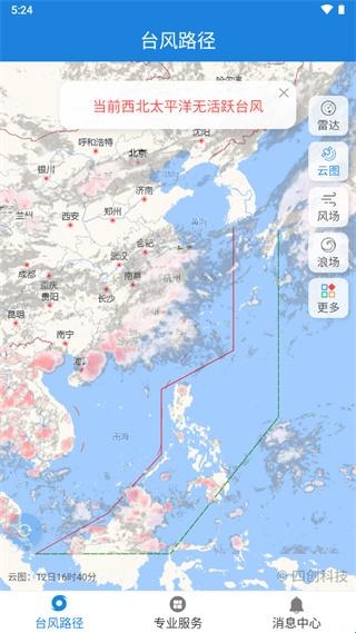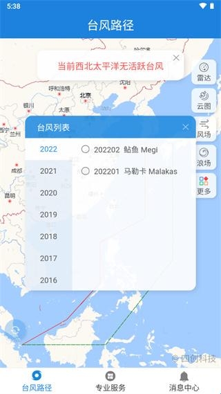 3、台风列表:显示当前西北太平洋活动的台风路径信息,可同时叠加历史台风、雷达图、卫星云图等气象资料。