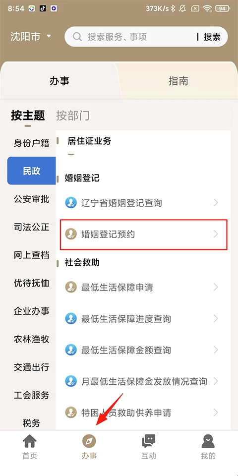 1、打开辽事通APP,点击【办事】-【民政】-【婚姻等级预约】;