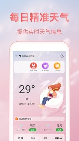 美人天气APP是一款占用内存小、界面清爽简洁的手机天气查询工具,可以帮助用户轻松查询全国各个城市地区的天气,精准的预测每日天气,24小时天气实时更新,轻松掌握天气的变化情况。而且异常天气还会及时为大家推送资讯,让大家做好预防措施,值得下载一试的哦!