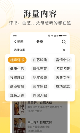 拥有文学名著、有声小说、曲艺戏曲、名家评书、搞笑段子、健康养生等上百个类别的高清正版有声读物,每天都有新的资源更新发布。
