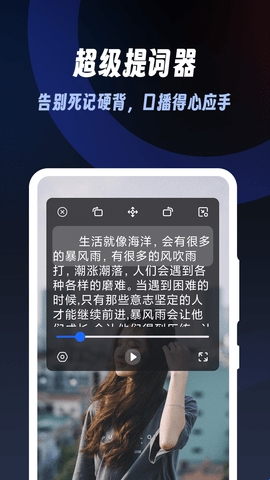 超级提词器:没有任何烦人广告弹窗的专业提词器软件。用户可以无限制的使用提词器系统,输入自己需要文本台词,支持字幕滚动,对于滚动的速度以及字体的大小和颜色都是可以调节的,软件可以轻松进行悬浮窗提词操作,所记录的文本可以悬浮在其他的APP上面,对于演讲、直播或者视频创作者来说都很友好,让你再也不不用担心忘词。
