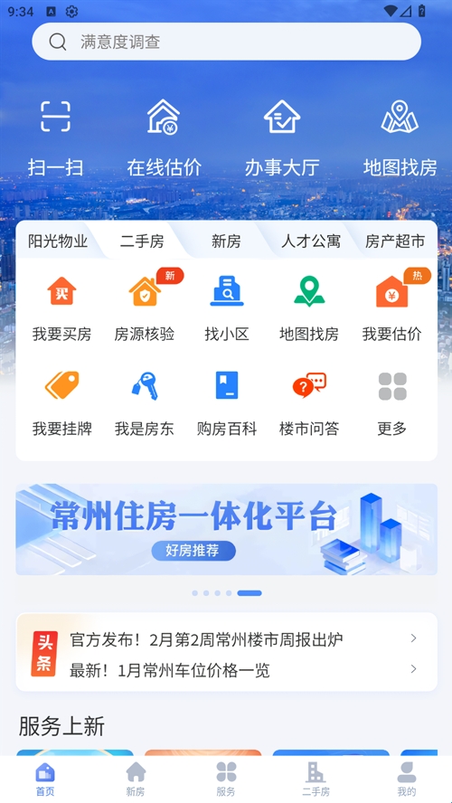 1、在首页界面下,我们能够看到一个布局合理简洁清晰的操作界面,在这里汇聚了一系列非常实用的功能,比如说:我要买房、房源核验、找小区、地图找房、我要估价等等。