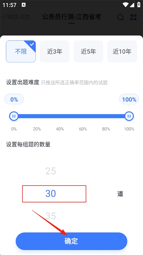 3、找到【设置每组题的数量】选项,点击数字按钮(如15道、25道、30道等)进行选择,确认题量后点击【确定】按钮,系统将按新题量生成题目。