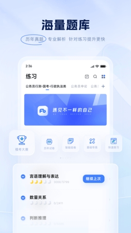 6、在原有公务员行测的基础上新增各种类型的考试模式,全方位的提升用户的学习。