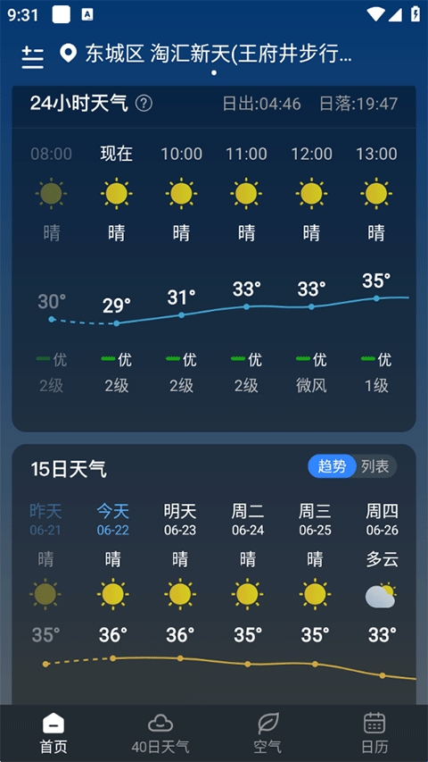 3、点击40日天气可显示您所在位置40日内的天气预报,为您出行做好万全准备;