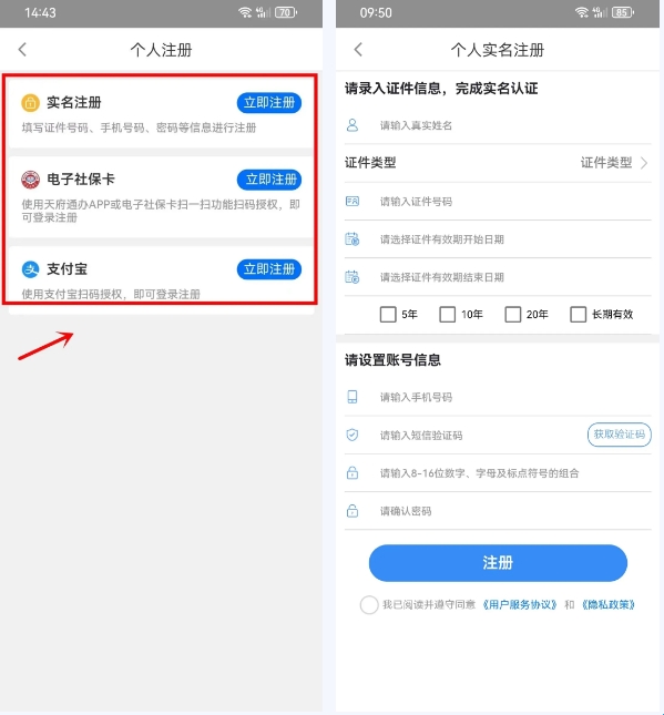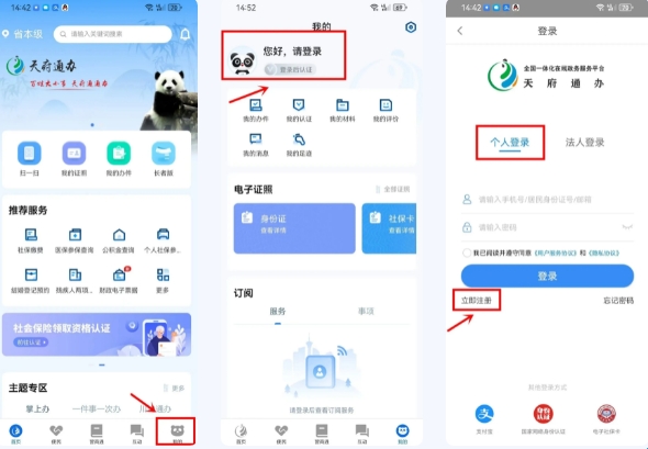 第二步:我们目前提供实名注册、电子社保卡、支付宝3种注册方式,以【实名注册】为例,点击实名注册右上方【立即注册】。按页面提示填写相关信息并操作,完成个人实名注册。注册成功后,您就可以用“天府通办”APP办事啦!