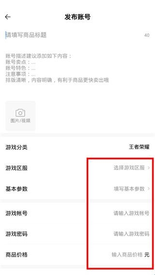 5、最后在发布商品页面中,填写基本的介绍以及游戏区服等等,进行发布即可。