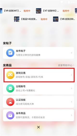 1、首先打开密马游戏交易平台,点击首页中间“发布”按钮。