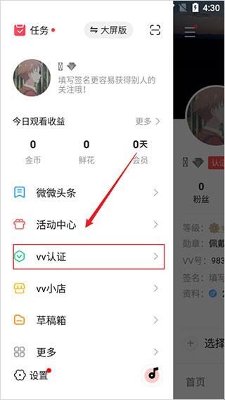 3、在打开的侧边页中,点击“vv认证”。