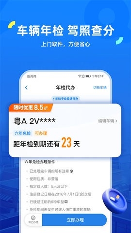 联合邮政上门服务,车辆年检在线一键搞定,有效年检期到期提醒。