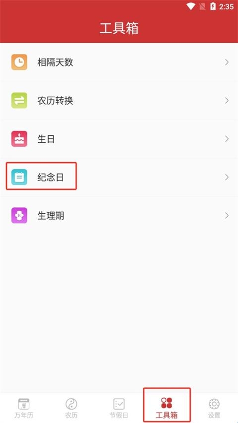 1、选择软件中的工具箱模块,这里面有很多的小工具,选择“纪念日”。