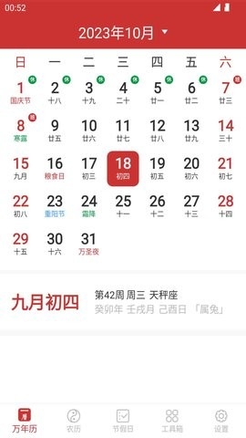 1、万年历日历功能,提供星座、属相、放假调休安排、农历节气、节日信息;