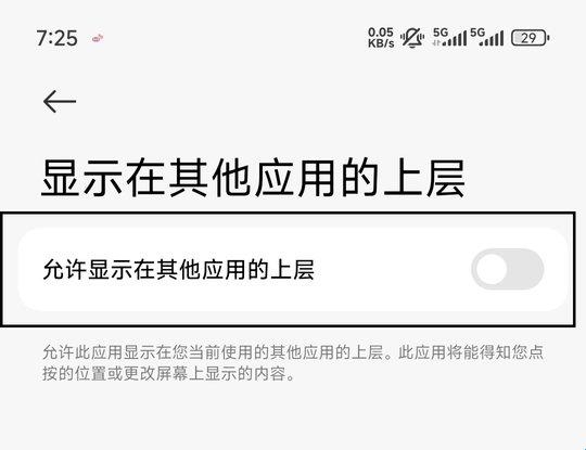 2、点击开启权限允许显示在其他应用的上层;