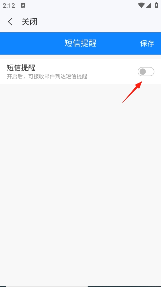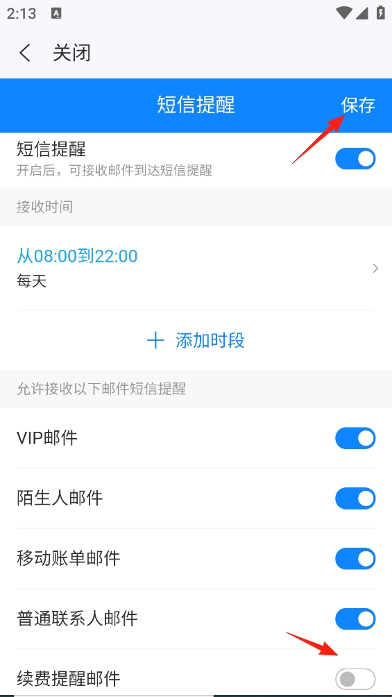6、记得将屏幕下方的“续费提醒邮件”开启,这个选项默认关闭,最后点击右上角的“保存”。这样就完成了“邮件达到短信通知”。