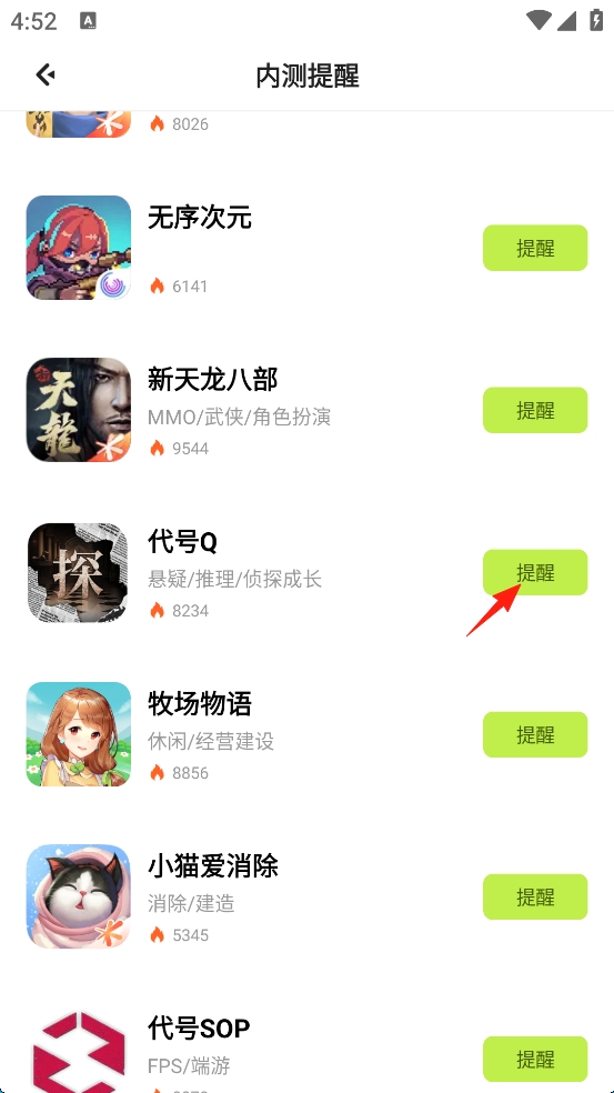 3、随后点击想要体验的内测游戏的“提醒”,当游戏需要内测时,会主动提醒用户。