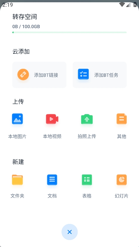 2、点击首页右下角的+按钮,您可以在这里上传图片、视频、文档到云盘中,也可以在云盘内新建文件夹文档表格以及幻灯片等。