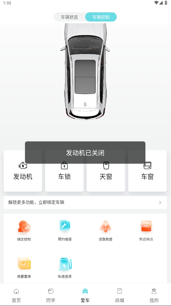 5、绑定之后即可进行查看奇瑞汽车车辆状况以及进行远程控制发动机等功能。