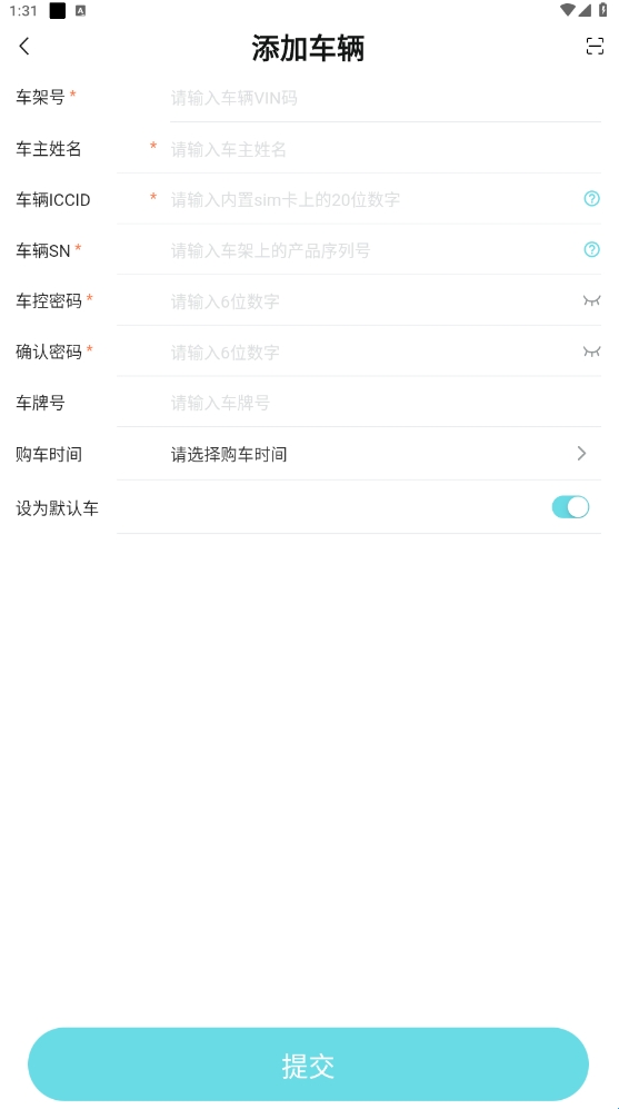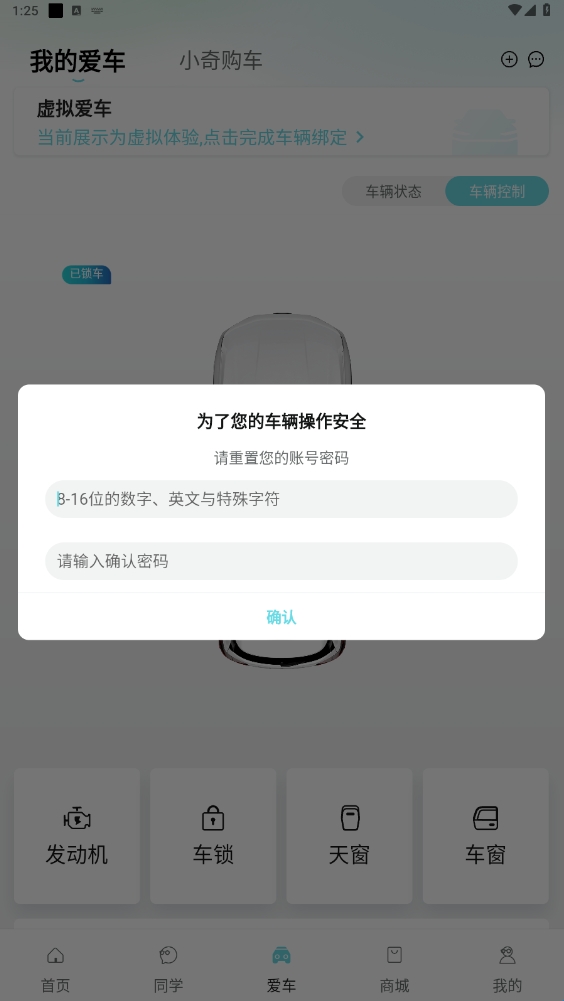 2、点击左上角进行车辆绑定(需设置车辆操作安全密码);