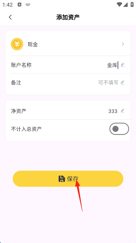 5、输入账户名称,备注,净资产,可选择不计入总资产,随后点击屏幕下方的“保存”。
