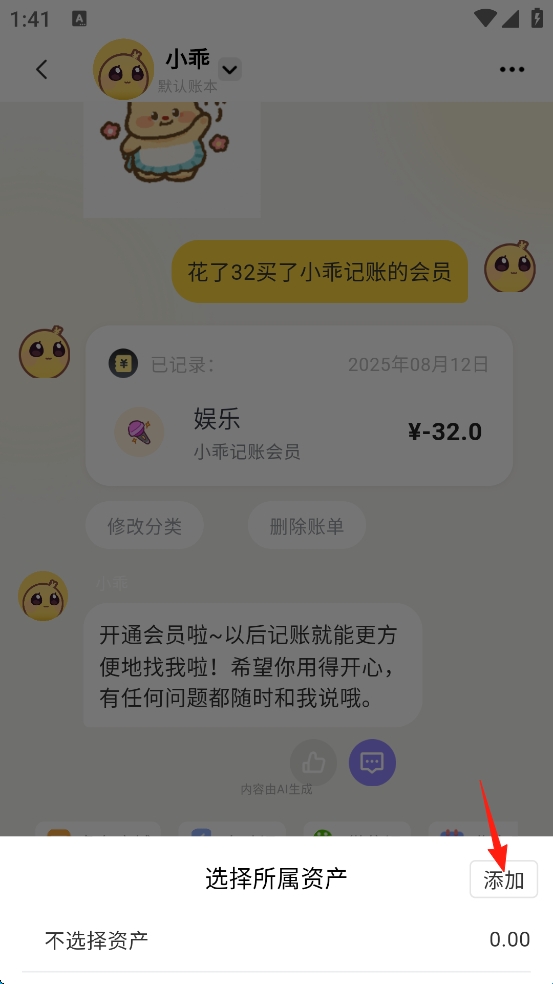 6、在聊天记录输入,支出收入资产和花费内容,随后自动记账。