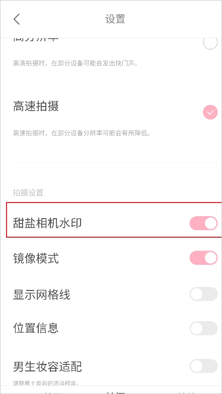 3、在设置页面中,找到甜盐相机水印标志,把后面的关掉,这样拍出来的照片就没有水印了哦