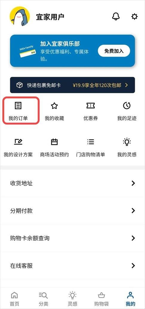 1、进入宜家家居官方网上商城app,在我的界面点击“我的订单”