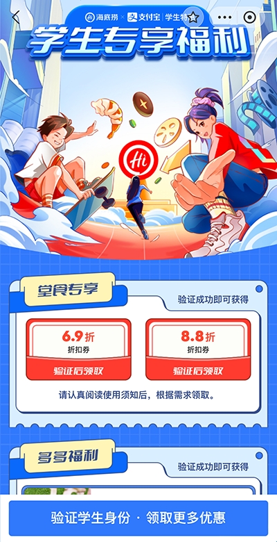 1、首先用户需要打开支付宝,搜索“海底捞”小程序,点击进入高校学生验证专享