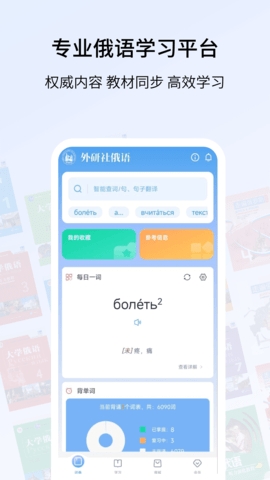 外研社俄语APP是一款专业俄语学习平台,权威的内容与教材同步更新,科学有效地的学习方法可以让大家高效地学习。依托外研社俄汉、汉俄词典数据库内容可以请查找想要的单词,音频支持离线下载,随时随地进行学习的。具有语音查词、通知栏快捷查词等便捷查词功能,真人发音为大家提供更好地的语言学习环境。