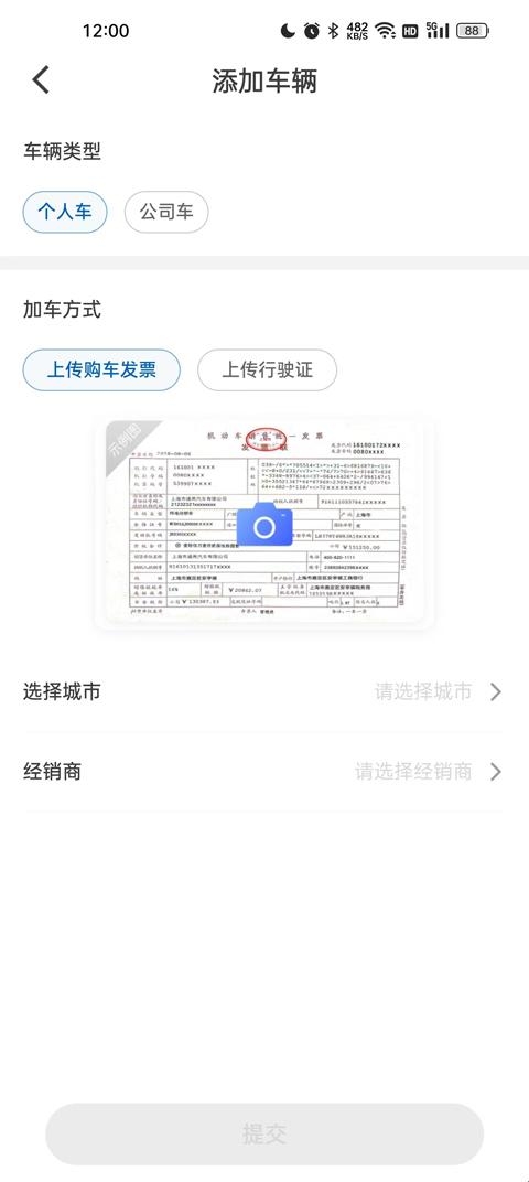 5、之后会进入到添加车辆页面,填写车辆信息、上传购车发票和上传行驶证之后,最后点击提交之后,就绑定好车辆了;