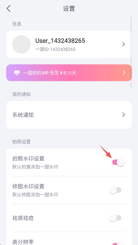 2、在点击“拍照水印设置”右侧的“开关键”。