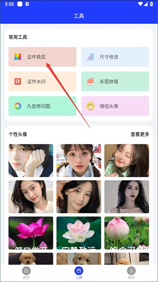 3、进入【工具】页面后,你可以按照自己需要的功能进入编辑图片,我们这里演示一下【证件换底】功能;