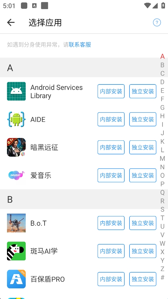 2、点开加号以后会显示你自己手机里的软件,点击字母选择软件制作相应分身。