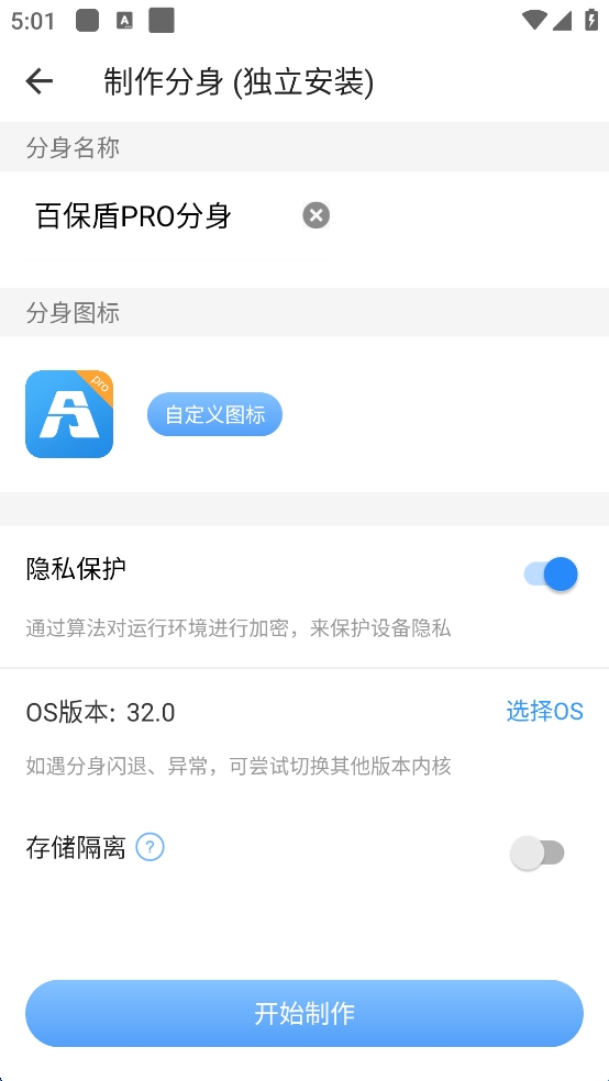 3、输入分身名称、分身图标,选择OS版本,目前可用插件有限,包括机型伪装、虚拟定位、分身锁。