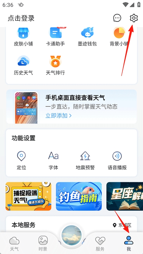 1、打开墨迹天气APP,点击我-右上角设置图标;