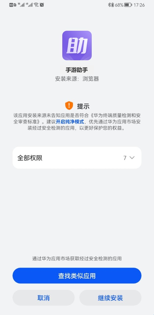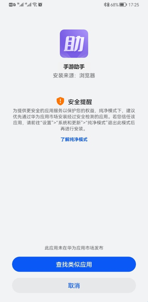 1、当您在鸿蒙系统的设备上尝试安装"手游助手"时,若系统弹出"纯净模式"拦截提示,导致无法继续安装,可按以下步骤解决问题: