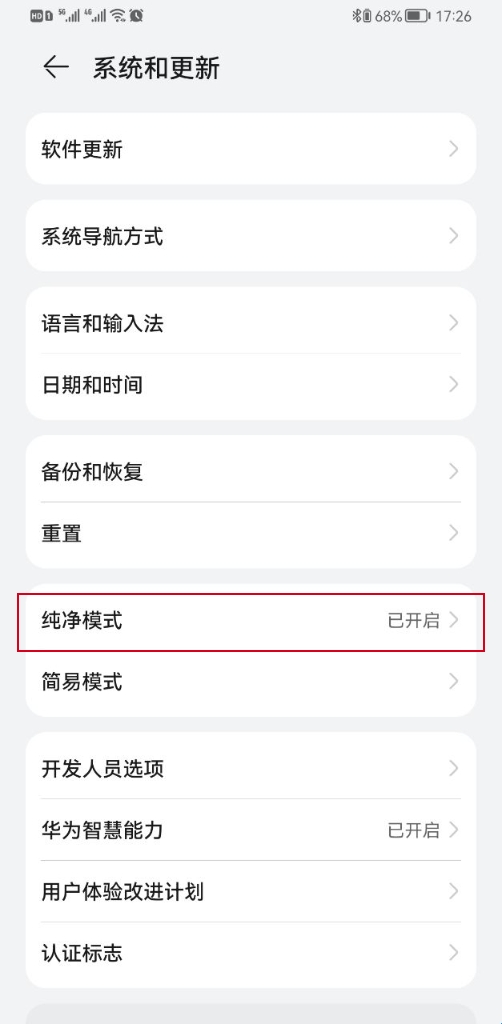 在「系统和更新」设置页面中,请找到并点击「纯净模式」这一菜单选项。