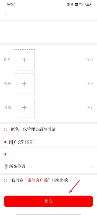 2、输入报料的标题,内容以及图片,可以选择匿名举报,勾选下方的服务条款,点击“提交”就可以了。