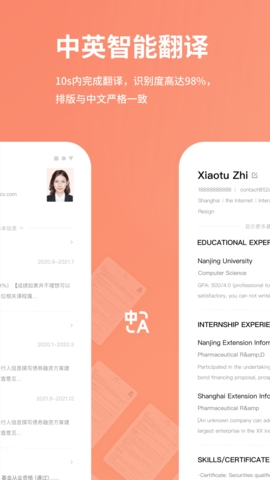 2、具有智能中英文简历翻译、一键排版、一键简历评估等功能满足用户的需求;