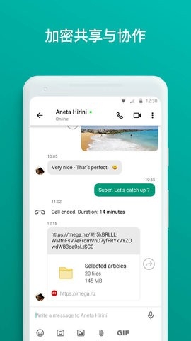 2、聊天日志可以在多个设备之间自动同步。您也可以在聊天中或从MEGA云磁盘添加文件。