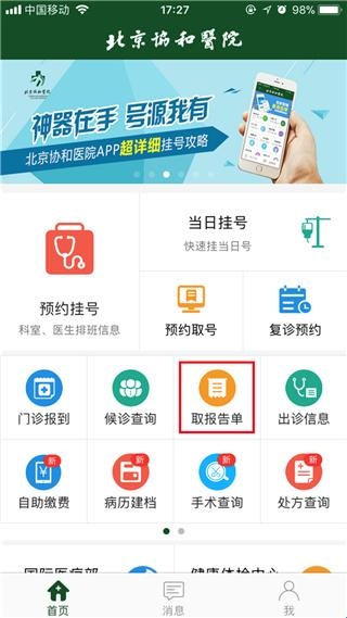 1、在APP首页点击【取报告单】;