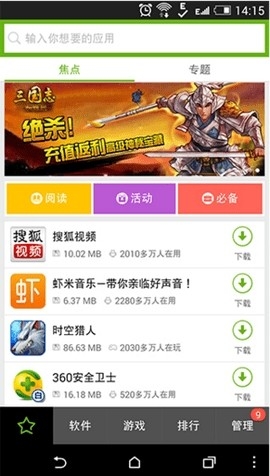 htc应用商店APP是一款综合性非常强的安卓应用市场软件,其收录各种类型的热门软件,每天推荐最潮流的优质App,在这里用户可以一键安装软件,更有断点续传,后台下载安装等功能,让用户体验到高速下载的体验感!软件还有非常智能的搜索功能,只要输入相关的名称或字,系统就能够把相关的信息呈现在玩家面前。