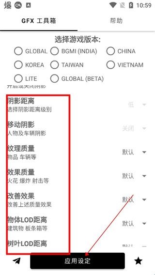5、此外在GFX画质修改器软件内还可以设置抗锯齿、阴影、纹理等多种数据修改,在设置完成后,点击底部“应用设定”既可开始体验啦!