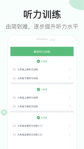 2、进入应用,第一眼就能看到主要功能——教材听力训练,初中七年级八年级九年级都有,真的很详细。