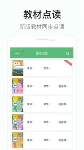 1、包含七年级到九年级的单词和课文(同步翻译),且都配有高清的真人发音,可跟读、可点读。