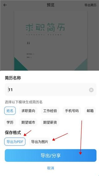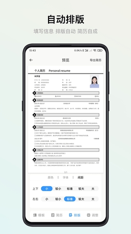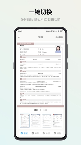 任意模板您都可以进行排版调整,一键生成简洁大方的个人简历。