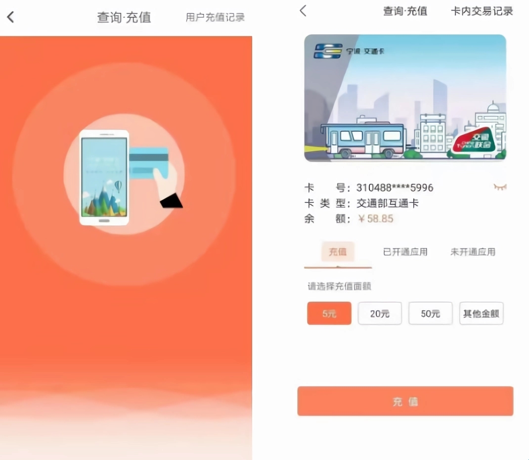 4、【查询·充值】提供基于NFC模块的实体卡贴卡充值。
